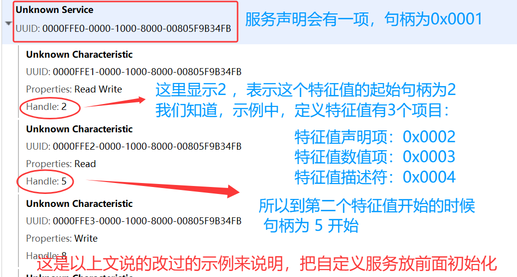 1、句柄位置取决于 ATT 数据库的初始化顺序 ,对于开发者我们上层来看,句柄的顺序就等于我们 “初始化 GATT 属性的顺序”, 蓝牙协议规范不强求这个顺序。只是通常情况,我们有一套惯例,比如服务 0x1800 (GAP Service) 是所有蓝牙从机必备的标准服务,通常情况下放在最前面。