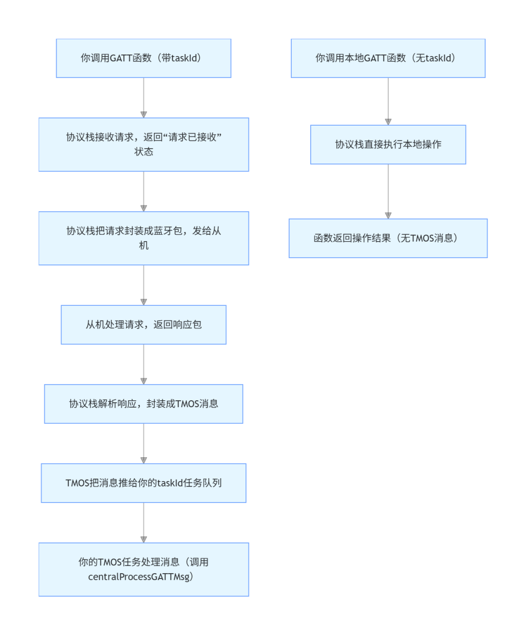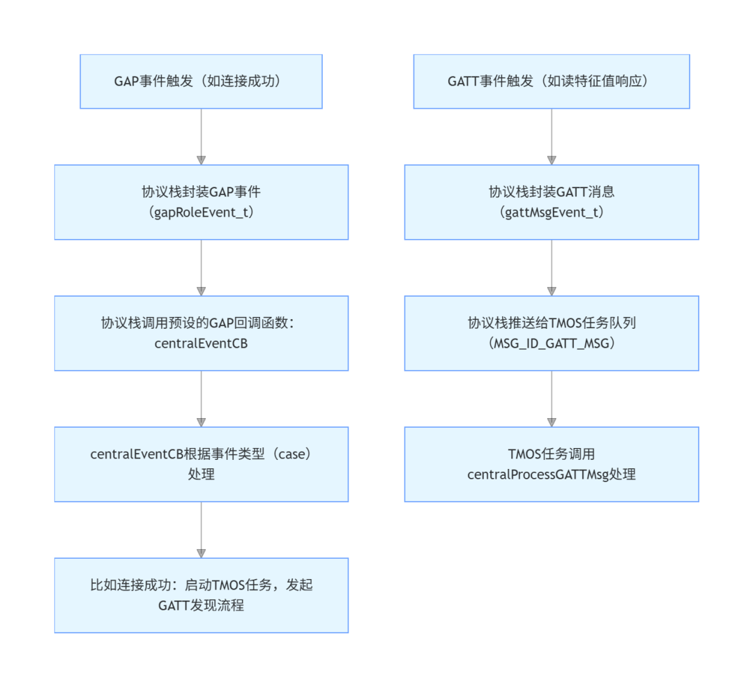 | 规则1 | GATT 层所有需从机响应的操作→ 走TMOS消息异步返回 | • 发现服务/特征值• 读/写特征值• 写CCCD使能Notify• 交换MTU | bStatus_t = SUCCESS(请求已发送)结果通过 GATT_MSG_EVENT 回调 |