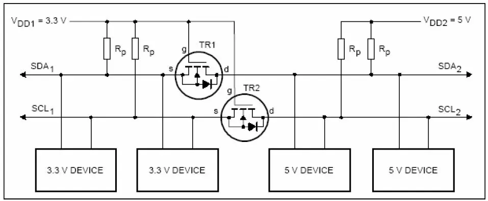 1) 从左到右通信(SDA2 为输入状态):SDA1 为3.3V 高电平时,Vgs=0,NMOS 管截止,SDA2 被电阻Rp 拉高到5V。