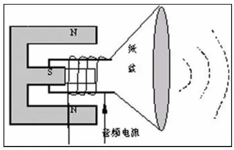 工作原理:动圈式扬声器是利用电流在磁场中受到磁场力作用的原理制成的。如下图所示,绕在纸盆上的导线构成的线圈处于同心圆盘形(截面是E 形)磁铁的磁场中,放大器送出的音频电流通过线圈,纸盆在磁铁的磁场驱动下就振动起来,纸盘上的鼓膜产生音频的振动,从而使鼓膜周围的空气振动起来而产生声音。