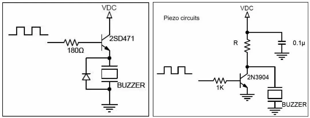 **76****如下左图是有源电磁式蜂鸣器的驱动电路,右图是有源压电式蜂鸣器的驱动电路。请问为什么左图需要二极管而右图不需要,左图二极管的作用是什么?**