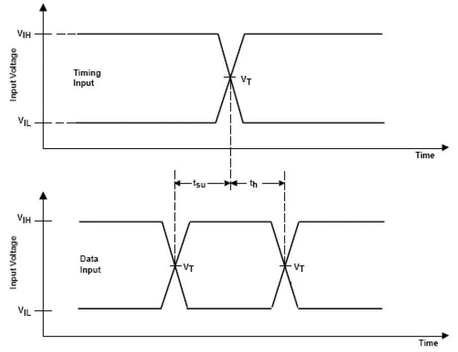 Setup-Time 和Hold-Time 是芯片对输入信号和参考时钟信号之间的时间要求。Setup-Time 是指参考时钟沿到来之前输入信号保持稳定不变的时间,Hold-Time 是指参考时钟沿过后输入信号保持稳定不变的时间。如果信号的 Setup-Time 和Hold-Time不满足要求,输入信号将不能打入触发器。如果输入信号在参考时钟沿前后稳定的时间均超过Setup-Time 和Hold-Time,那么超过量就分别被称为Setup-Time 裕量和Hold-Time 裕量。如下图,tsu 为Setup-Time,th 为Hold-Time: