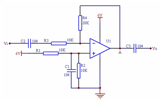 R1、R2 和C1 的作用是提供1/2 的电源电压3V 作为参考电压。 电路的放大倍数是-2。