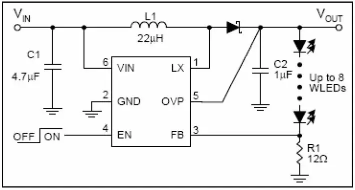 这是恒流驱动的升压电路,可通过调整FB 引脚的对地电阻R1 来调整输出电流,从而调整LED 的亮度,输出电流Iled=Vfb/Rfb。通过调整EN 引脚的开关波形也可以调整LED 的亮度,比如EN 引脚输入大于50Hz(小于50Hz 人眼会感到LED在闪烁)的PWM 信号,改变PWM 信号的占空比即可调整LED 的亮度。