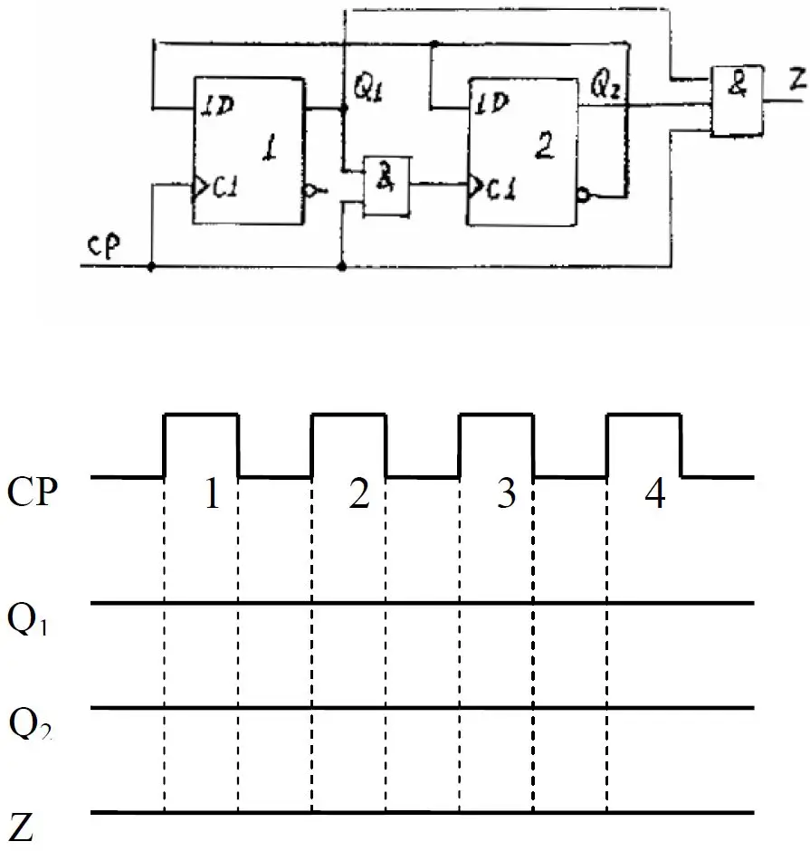 ****96****分析下列时序电路,画出连续4 个CP 脉冲作用下,Q1,Q2,Z 的输出波形,说明是几进制计数器,有否自启动功能。****