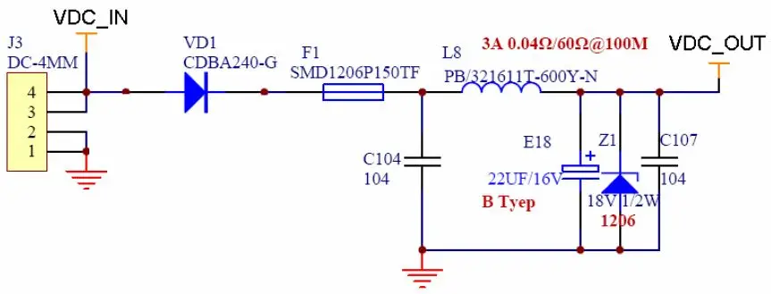 J3 是输入插座,用于连接输入电源。VD1 是防止反接的二极管,要选反向击穿电压大,正向导通电流大,导通压降小的整流二极管,比如肖特基势垒整流二极管。F1 是限流的保险丝,最好选择有可恢复的,比如自恢复PTC 保险丝。C104、C107 是0.1uF 的滤波电容,和L8 一起组成一个π型滤波电路,滤除高频噪声。L8 是60Ω@100MHz 的磁珠,用于滤除高频干扰,同时起到一定的限流作用。E18 是22uF 的B 型钽电容,用于滤除电源中的低频噪声。Z1 是18V/0.5W 的稳压二极管,防止输出电压大于18V。Z1 不能放在F1 之前,因为大多数稳压二极管失效之后是短路状态,这样输入电压VDC_IN 经过VD1 被短路到地,没有起到保护输入电压的作用。