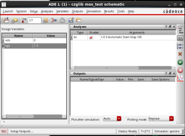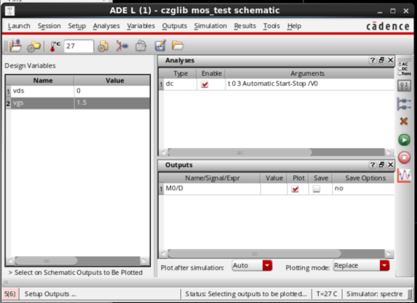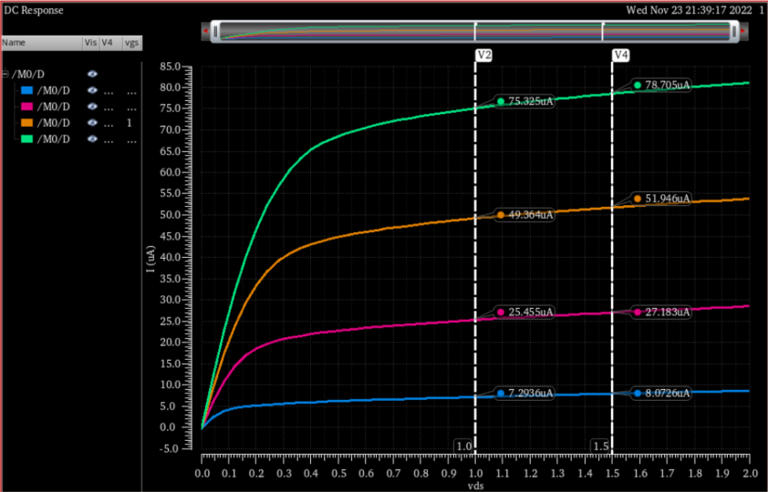 上一篇文章已经得到了在不同的vgs下的vds参数曲线。原理图如下。W为220um,L为180um,后面会用到。