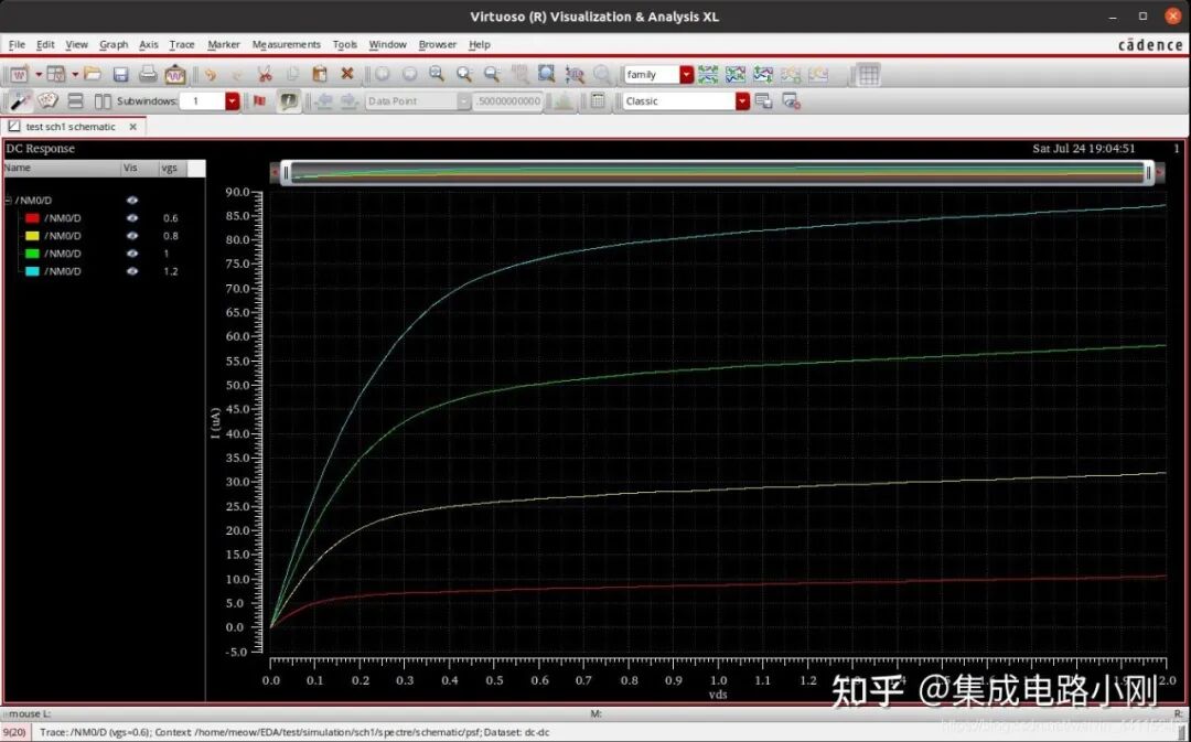 为了更精确得到数据,这里改变一下扫描范围,vds范围改为0-2V,vgs范围改为0.6-1.2V,步长设置为0.2V,得出结果如下图。