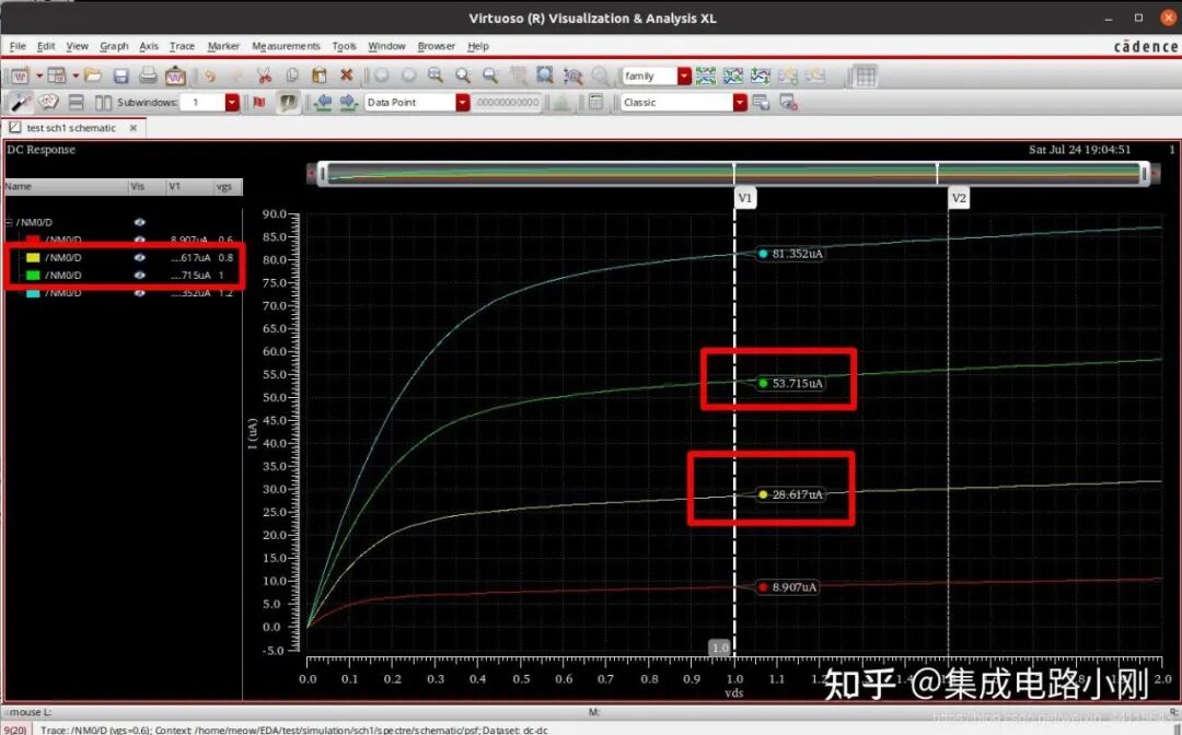 添加垂直标记后的效果,点击标记,就能显示出数值。这里为了方便计算,我选择vgs对应0.8V和1V下的数据,此时vds选择的是1V和1.5V。
