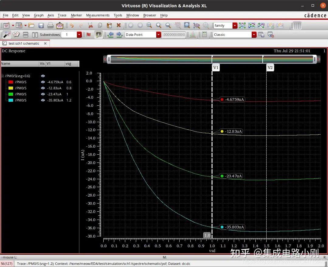 为了更精确得到数据,这里改变一下扫描范围,vsd范围改为0-2V,vsg范围改为0.6-1.2V,步长设置为0.2V,添加1V和1.5V的Marker垂直标记线后,得出结果如下图。