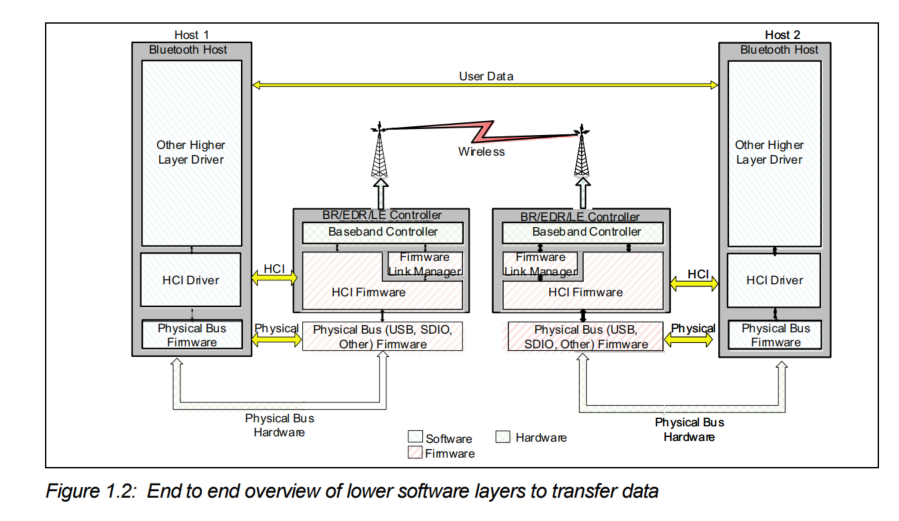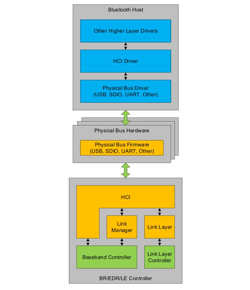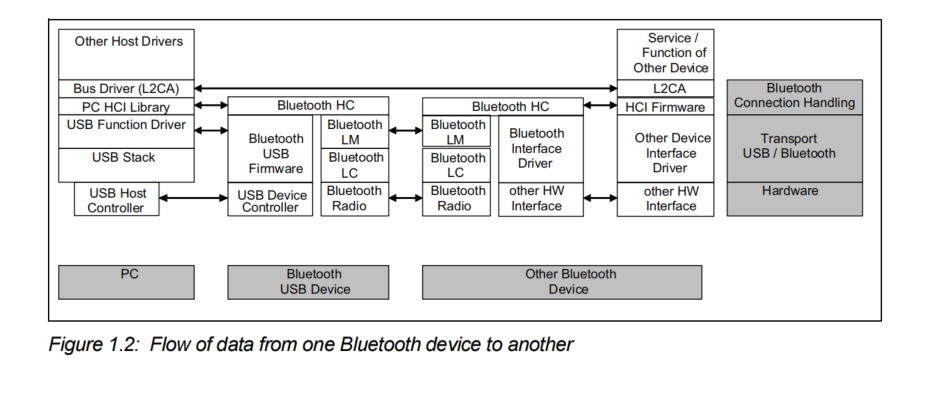 Host Side (PC)──────────────────────────────────────────L2CAP / RFCOMM ↓HCI Library ↓USB Stack → USB Host Controller →───┐ │Controller Side (Bluetooth USB Device)──────────────────────────────────────────USB Device Controller ← Bluetooth USB Firmware ↓Bluetooth LM / LC ↓Bluetooth Radio → Over-the-air → Other Device