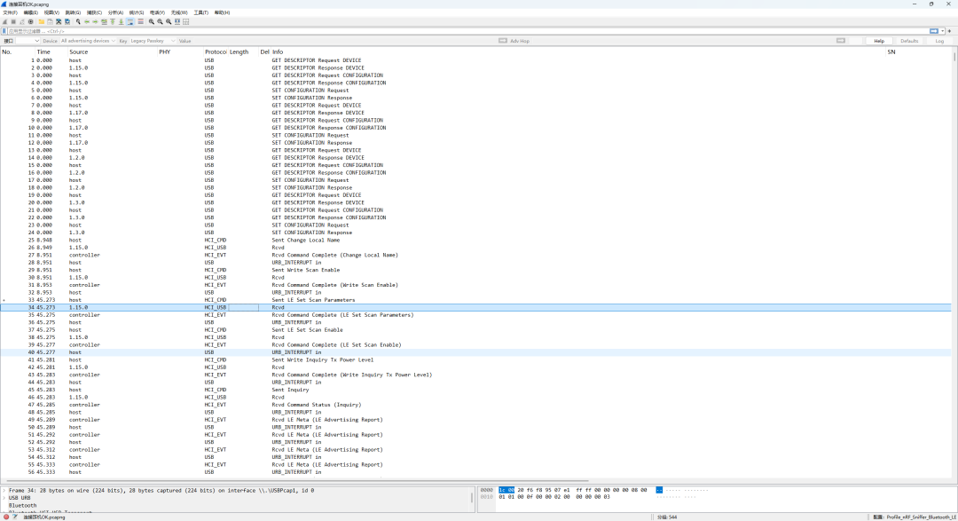 通过 Wireshark 抓取到的蓝牙 HCI 的数据包,我们可以看到有抓到 USB、HCI_USB、HCI_CMD、HCI_EVT.. 这些协议的数据。
