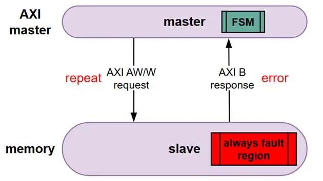 这个例子中,master是AXI master,slave是下游memory,如图2所示。AXI master内部有一个状态机FSM,它控制这AXI写数据的过程。当AXI master往下游发起AW/W后,下游返回response error话,那么这个状态机会跳转到重新发送的状态。如果下游slave memory出现问题,出现always fault region,则会一直返回response error,AXI master的状态机就会反复循环跳转,无法结束,这就导致AXI master出现卡壳。