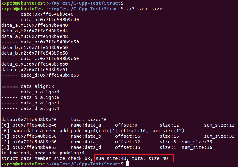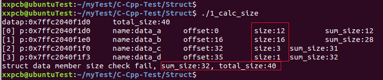 经过上述的分析,可以对show_struct_member_size_info增加字节对齐中内存填充大小的计算,然后再验证累加的大小(包括字节填充)与整体的大小是否一致,代码如下: