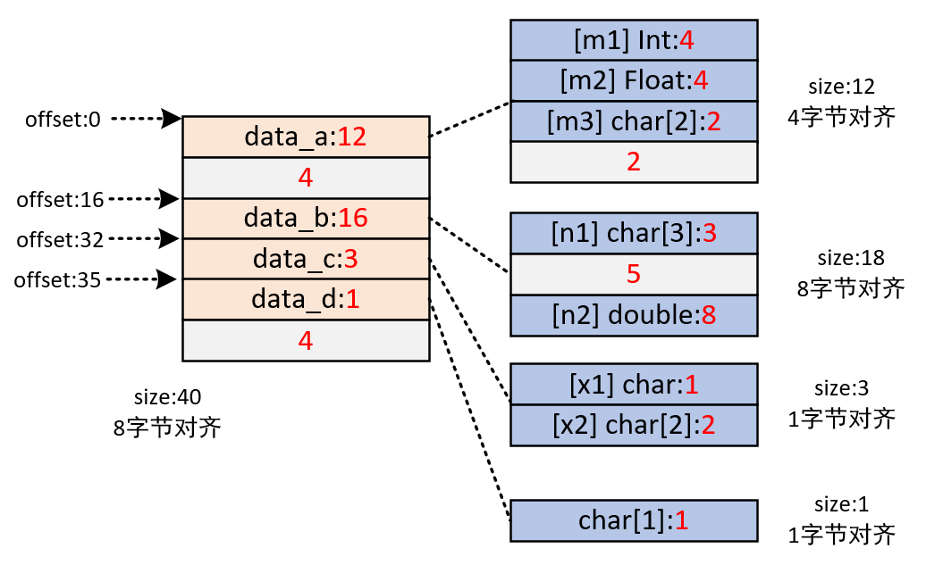 - 对于8字节对齐data_all,显示需要在data_a后补4个,凑够了8,data_b是8的倍数,不用管,后面的data_c和data_d,加在一起还不够8,所以最后再补上4