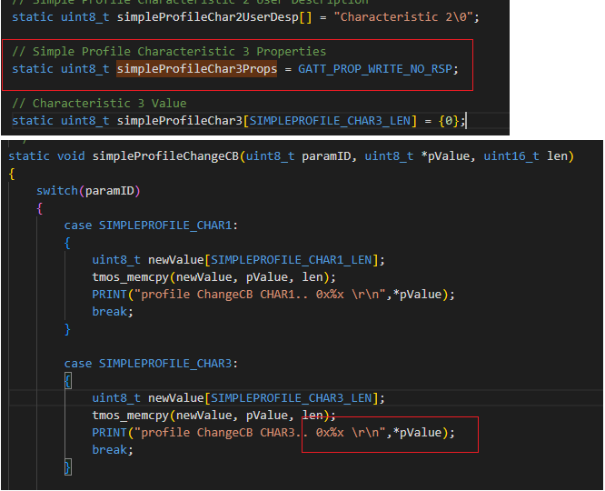 然后在事件中写特征值,使用GATT_WriteNoRsp 函数,不需要响应参数就不需要任务ID,这里直接放代码: