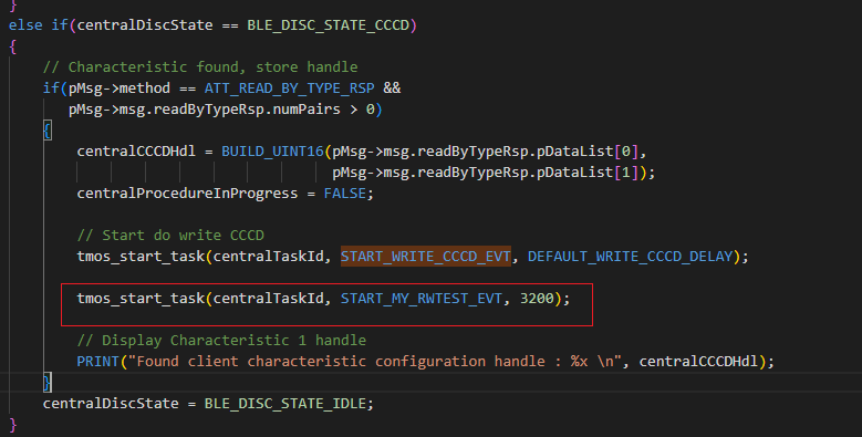 我们在主机示例中,也修改一下给这个特征值写数据,这里因为我们能够算出来 CHAR3 的句柄,我们就不再去额外写 获取 CHAR 3 的句柄的程序了,我们直接在示例获取完 CCCD 后面增加一个自己的测试任务,给CHAR3 写数据: