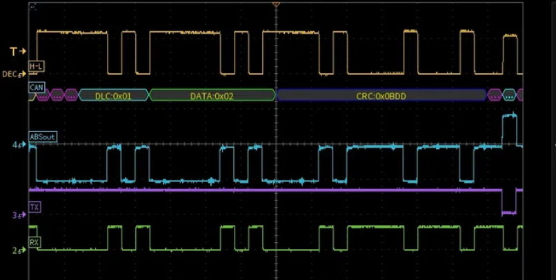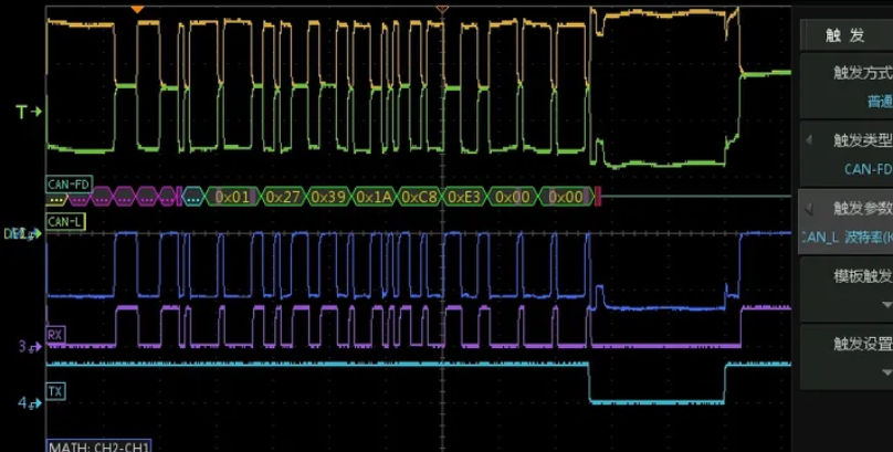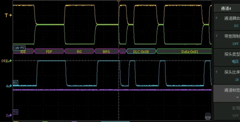 我们将示波器的差分探头和电流探头挂在接收端,下图黄色为H-L的差分电压,蓝色为接收节点的输出电流,RX为收发器将H-L差分电压转换出的逻辑波形,MCU内部的CAN控制器会根据RX的0/1来解读总线。TX为接收节点的发送逻辑,MCU将TX拉低的时候收发器会往总线上驱动显性。