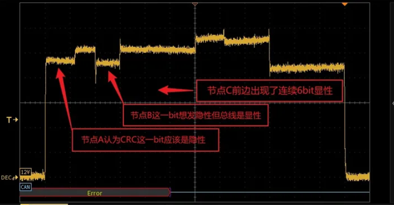 在这时,接收节点收到第6bit显性0的时候,因违背逢五补一的位填充规则,也会往总线上输出“主动错误标志”,所以会在总线上看到连续12bit的显性0,前6个来自发送节点,后6个来自接收节点。