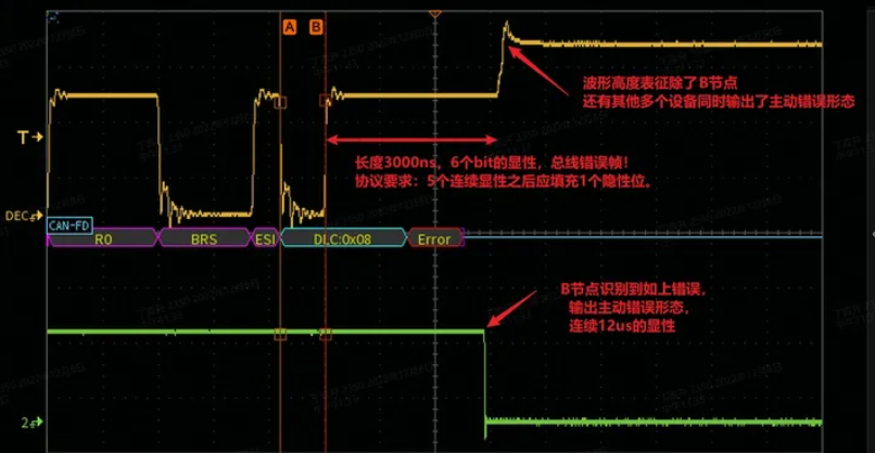 综上三条,认为节点C所在位置干扰过大/分支线路过长,节点C自己回读↓下图↓框出的bit位失败,自己往总线上输出“主动错误标志”(连续6bit=2usx6=12us的显性),其他设备在接收到第6个CAN-FD的bit=0.5usx6=3us的时候就读到了错误(违反FD速率的“逢五补一”规则),也往总线上叠加2us*6=12us的主动错误标志。然后,12us时节点C的主动错误标志先结束,其他节点的主动错误在2usx6+0.5usx6=15us后结束。至此,错误帧形态完成。