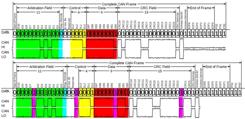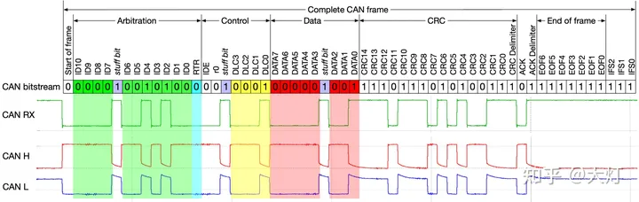 回顾完物理层,咱来看链路层,CAN帧的标准格式。当发送节的MCU将TX由1变0的时候,CAN收发器将CAN-H拉高&CAN-L拉低,接收节点收到了H-L>0.7V的压差后,接收节点的CAN收发器RX输出由1变0。下图是一个节点接收到CAN波形后解码出的RX逻辑。