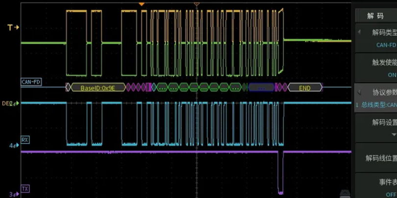 来看一个A B C三节点CAN-FD错误帧的案例,节点C发,节点A、B收:黄色是H-L的差分电压,绿色是节点B的逻辑TX。0x0677和0x0176是两个错误帧。FD区波特率设置为2Mbps。