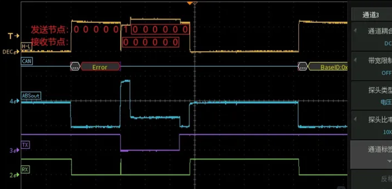 - 结合已知ID是哪个节点发的先验信息,逐个拔掉非终端节点,示波器观察“主动错误标志”,就能模糊定位错误源头;
