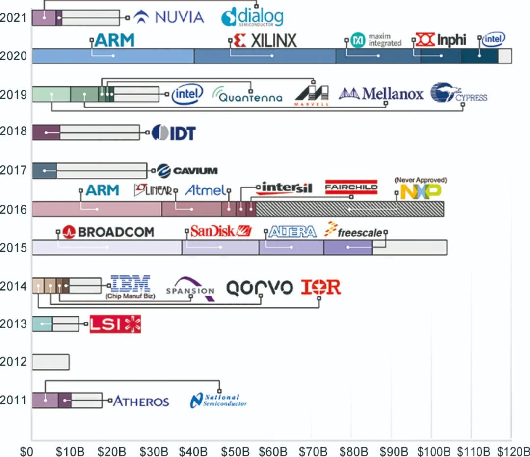 为了了解这个图表的背景,有几件事需要注意:①这些是交易公告,所有的交易不一定都能落实。这可能有多种原因,包括被股东拒绝,管理层的抵制,以及得不到监管部门的批准,就像2016年高通公司以近400亿美元收购恩智浦(NXP)的失败。② 2011-2020年的基础累积估值数据来自《麦克林报告》(IC Insights 2021 McClean Report) ( IC Insights, 2021)。2021年的基础累积估值数据估计为220亿美元,但只包括前8个月的并购公告报告(Design & Reuse, 2021)。③我们借用了《麦克林报告》中的基准假设,最主要的假设是覆盖范围包括“半导体公司、业务部门、产品线、芯片知识产权(IP)和晶圆厂的购买协议,但不包括IC公司对软件和系统级业务的收购……半导体资本设备供应商、材料生产商、芯片封装和测试公司以及设计自动化软件公司之间的交易”。