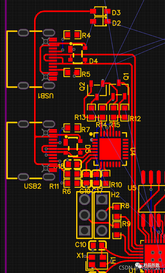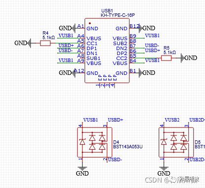 然后和芯片通讯的USB接口画好: 整个板子是USB口供电的,供电部分通过D2、D3出来,目前暂时放在那个位置; CP2102部分还有一个3.3V的电源需要过来; 还有芯片的 GPIO9 和 RESET 引脚需要和 CP2102 上边的2个三极管链接。