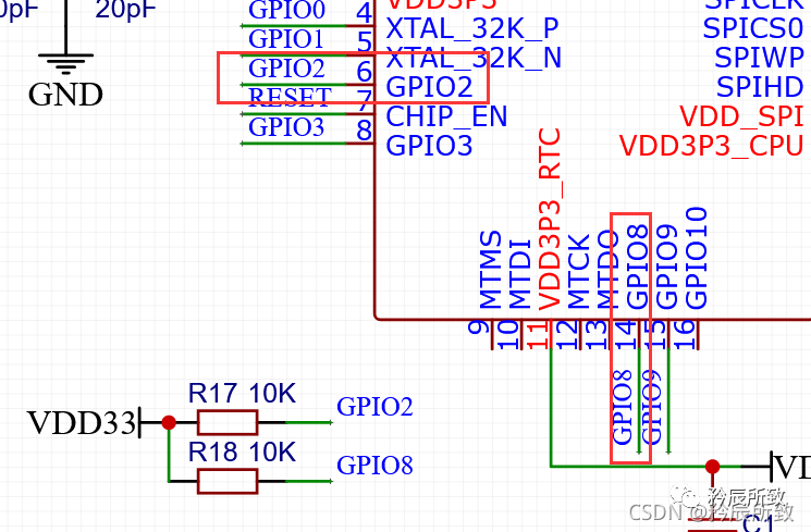 GPIO2,GPIO8 虽然很多开发板上都没有单独处理,而且也会将其用于普通IO,我这里不使用,直接给一个上拉电阻: