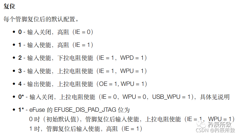 这3个引脚称为 Strapping 管脚,其中 GPIO9 默认连接内部上拉电阻,如需改变 Strapping 管脚的默认值,用户可以应用外部下拉/上拉电阻,或者应用主机 MCU 的 GPIO 来控制ESP32-C3 上电复位时的 Strapping 管脚电平。复位释放后,Strapping 管脚和普通管脚功能相同。