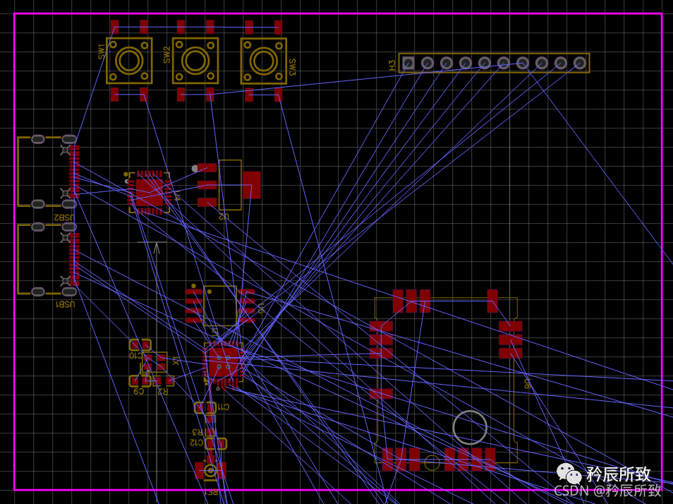 电源入口两个USB口肯定是并排防止在一端,因为两个射频芯片确定了位置,在上端,所以USB放在下面,因为两个USB都是需要和ESP32-C3连接通讯的,所以自然选择靠近ESP32-C3的位置,那就是左边,所以USB放在了左下角,然后3个按钮自然在右下角了(虽然按钮也是需要和ESP32-C3连接的,但是按钮的高低先平信号相对USB的信号,优先级肯定更低了)。