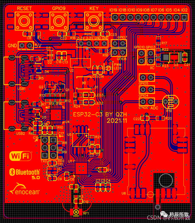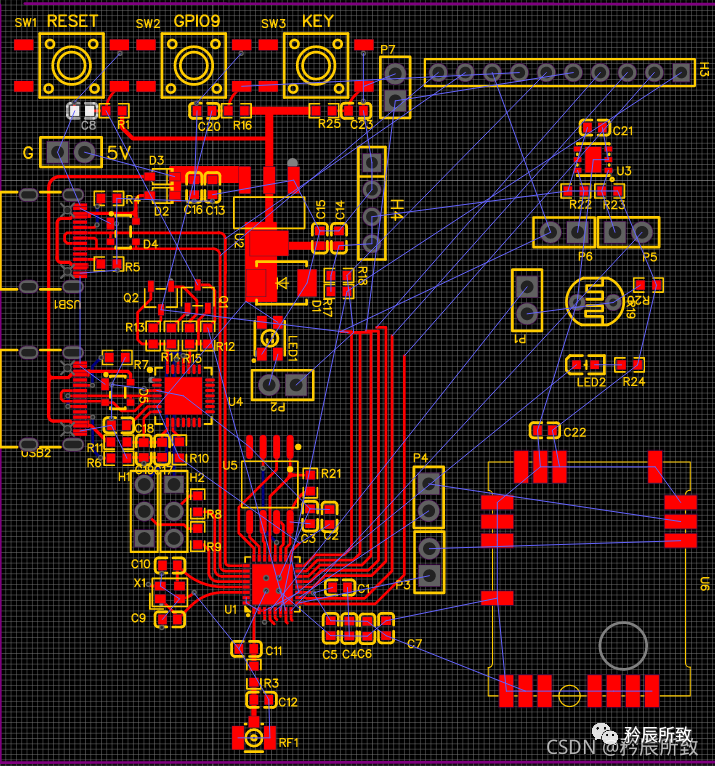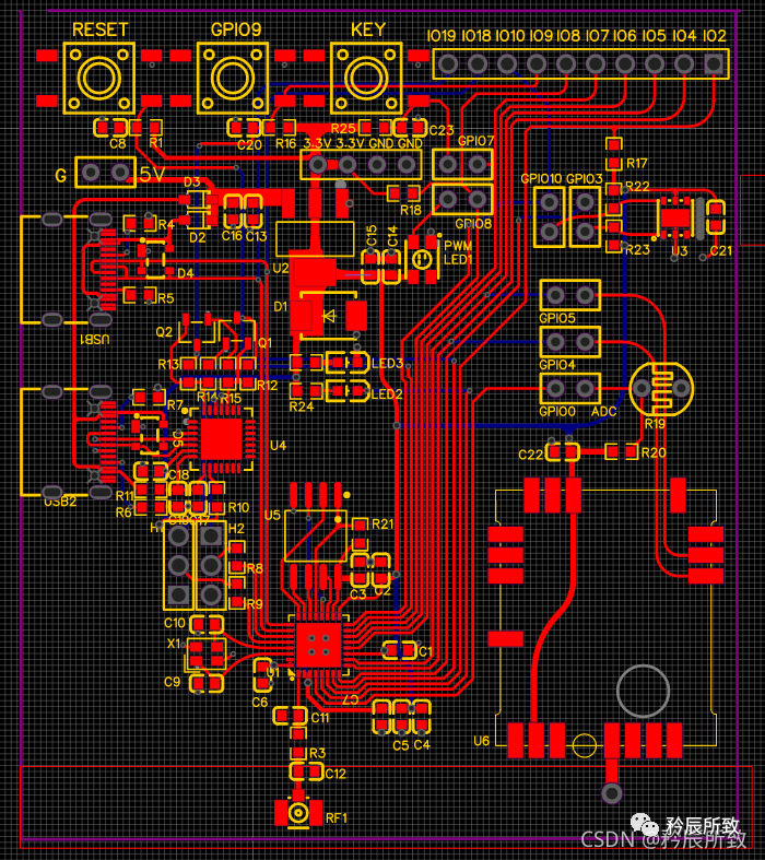 整理布局简单介绍一下,ESP32-C3 需要接天线,天线部分尽量不能有元器件,铜皮也尽量不要覆盖,所以选择边缘角落是比较合适的,右边的U6也是无线射频芯片,需要有天线,同理所以也是放边缘角落。