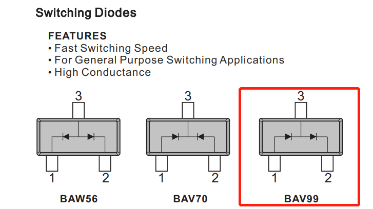 图1蓝色框内是二极管钳位电路的一般结构,多见于芯片输入端。当然还有专门的开关二极管,如下图2红色框内所示。本文主要针对此类型的二极管电路做一些简单介绍。