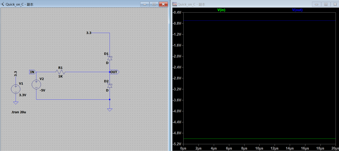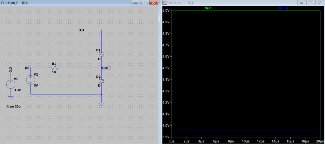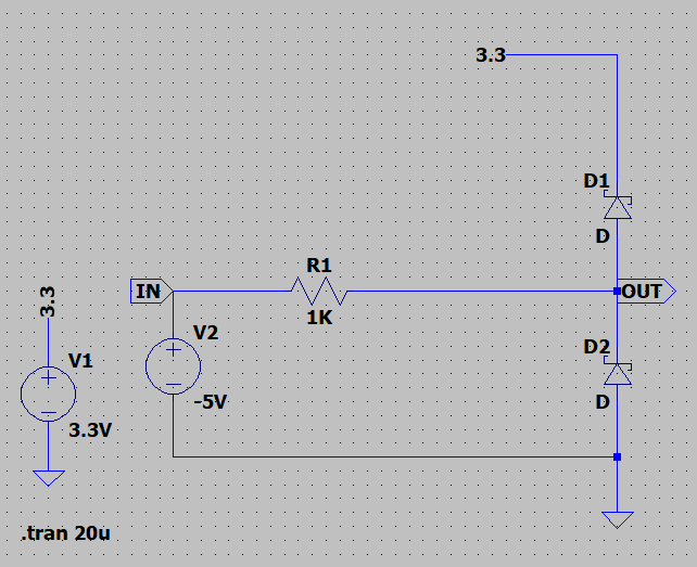 实现原理:下图3是用LTspice进行仿真的图形,D1和D2是肖特基二极管,正向导通压降Vf在0.7V左右。V1是电源,模拟单片机供电电源,V2是输入信号源。