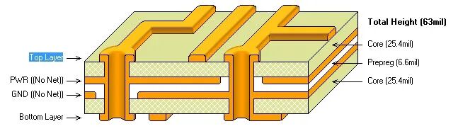 从上面这个4层板可以看出,POWER和GND之间填充的PP,两面带有铜箔的是Core芯板。所以,多层板其实就是Core与Prepreg压合而成的。