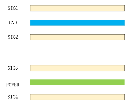 这种叠层设计,电源和地的耦合效果好,阻抗低,电源平面受到的干扰可以很快的泄放到地平面上。但是S2,S1以及S3,S4相邻,信号完整性容易受到对方层的干扰。