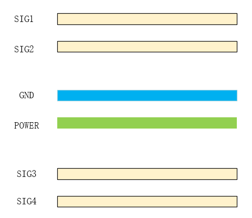 这种叠层,电源和地相隔较远,耦合比较差,电源和地之间无法形成寄生电容,为了保证电源到地的低阻抗,只能依靠外部的去耦电容来降低。