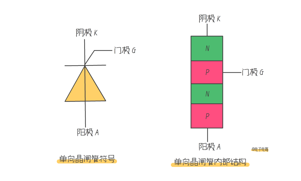单向晶闸管由一个N-P-N-P四层半导体构成的,中间形成了三个PN结。有三个电极,分别是阳极A,阴极K,门极G(也叫控制极)。
