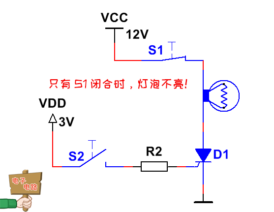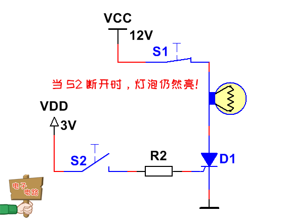 如下图,当S2闭合时,门极G承受触发电压,晶闸管导通,灯泡被点亮。