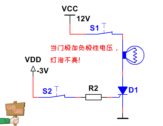 如下图,当门极G加负极性电压时,晶闸管不会导通,所以灯泡不亮!