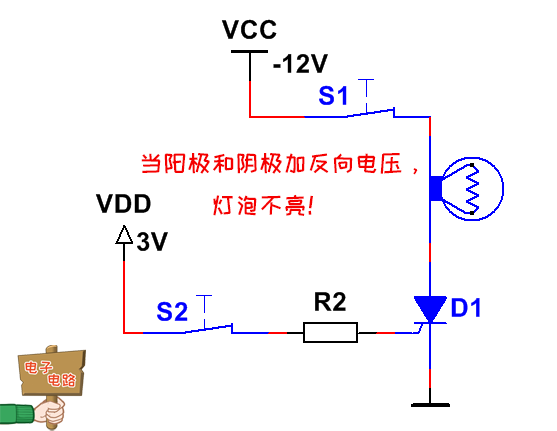 如下图,当阳极和阴极加反向电压,晶闸管不会导通,灯泡不亮!