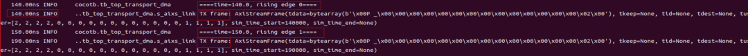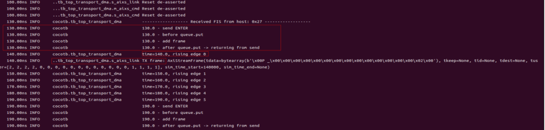for i in range(2): await device_to_host_source.send(frame) for _ in range(2): await RisingEdge(self.dut.clk) dut._log.info(f"time={cocotb.utils.get_sim_time('ns')}, rising edge {_}")
