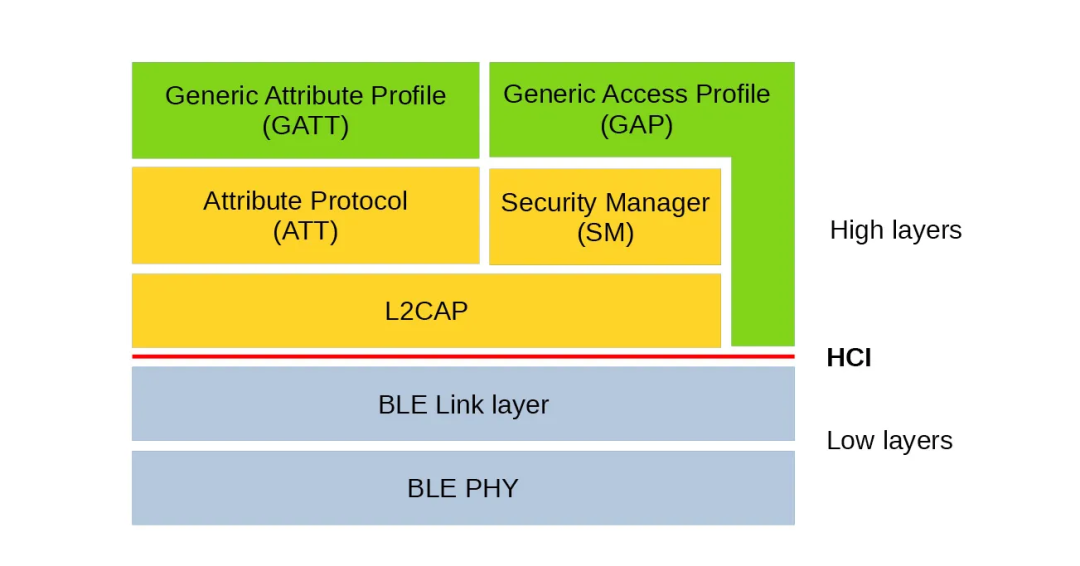 LE 当然也包含 PHY 层和链路层,但它们与蓝牙经典协议有所不同。BLE 的这些底层通过 HCI 与高层进行接口连接,这与金典蓝牙相同。