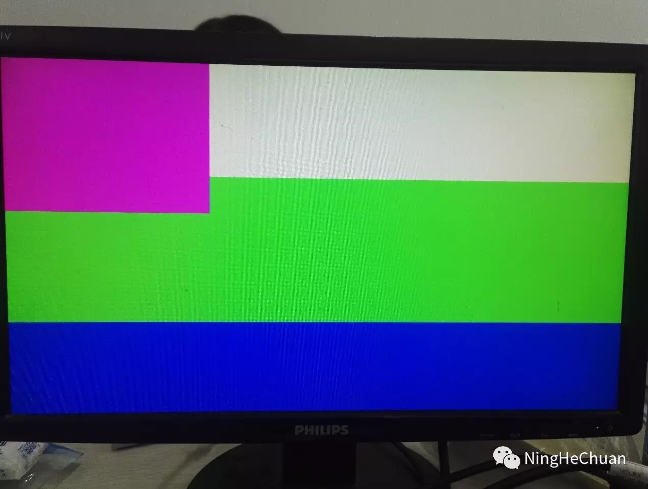 要显示一个彩色条纹也是比较简单的,例如在前一百五十行给VGA的数据为白色的,中间180行给VGA的数据为绿色,后面相同的方法。我这里要做的实验是在显示屏的左上角开一个200x200的框,最后将一幅200x200的图片显示进去,首先开一个200x200的正方形框,实现的方法就是控制行有效计数器计到需要显示正方形框的时候紫色的数据给lcd_data,行计数器为0-200,其他情况还是前面显示条纹的数据,同样的场有效计数器也从0-200计数时显示紫色数据带lcd_data,这样就会在显示屏左上角形成一个正方形的框。如下图所示。