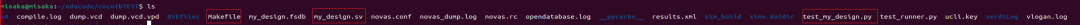 # Makefile# defaultsSIM ?= icarusTOPLEVEL_LANG ?= verilogVERILOG_SOURCES += $(PWD)/my_design.sv# use VHDL_SOURCES for VHDL files# TOPLEVEL is the name of the toplevel module in your Verilog or VHDL fileTOPLEVEL = my_design# MODULE is the basename of the Python test fileMODULE = test_my_design# include cocotb's make rules to take care of the simulator setupinclude $(shell cocotb-config --makefiles)/Makefile.sim