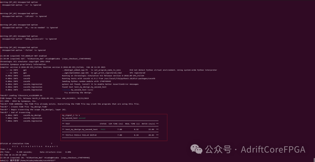 本测试使用的是Cocotb+VCS+Verdi的仿真环境,如果使用其他工具仿真需要用其他的命令,建议参考cocotb和仿真器的官方文档。