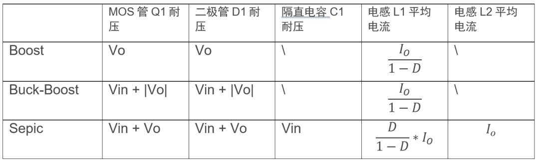 Sepic的输入输出电压公式与Buck-Boost相同,为: