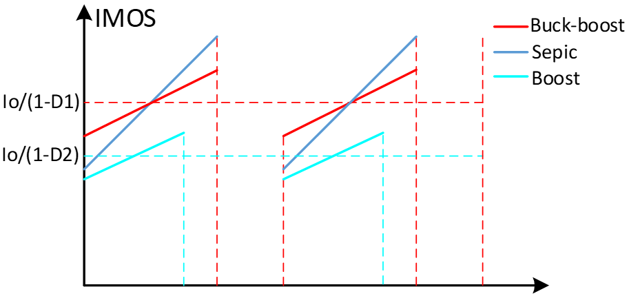同种条件下Boost拓扑上电感电流的平均值会低于Buck-Boost和Sepic,MOS管和二极管上的平均电流也会更低。而Buck-Boost的电感电流平均值为Sepic拓扑的两个电感平均电流之和。