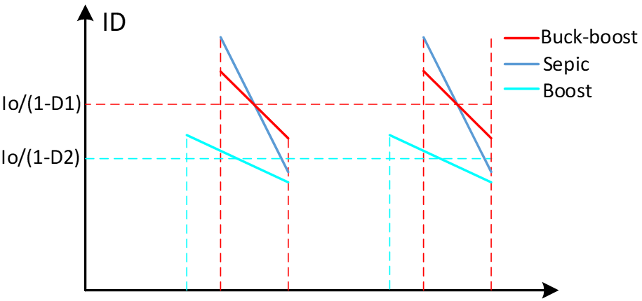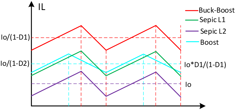 总结一下三种拓扑的电压电流特性。注意对于同样的输入输出电压,Boost拓扑的占空比D要小于Buck-Boost和Sepic